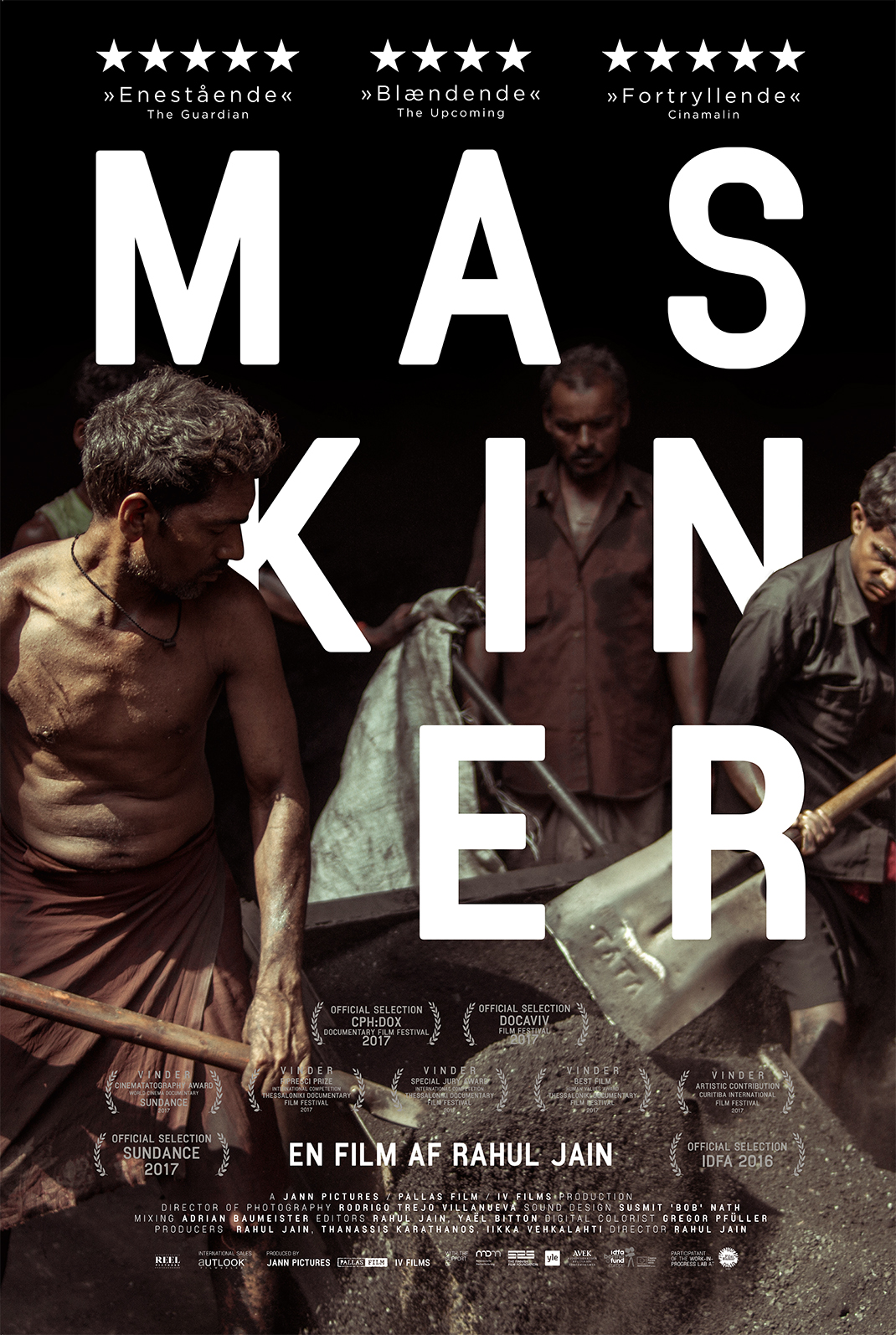 ”Gud gav os hænder, så vi er nødt til at arbejde,” siger en af arbejderne i dokumentarfilmen MASKINER, der følger hverdagen på en gigantisk tekstilfabrik i en af Indiens fattigste provinser. I stedet for at være unødigt belærende eller pege fingre af landets trøstesløse kastesystem lader instruktør Rahul Jain maskinernes summen og arbejdernes monotone rytmik skabe deres egen fortælling. Ingen voice-over eller underlægningsmusik. Det gør MASKINER til en både poetisk og tankevækkende oplevelse. For mens det på den ene side er grumt at overvære en børnearbejder konstant falde i søvn og være tæt på at få fingrene i maskinen, er der samtidig en æstetisk skønhed i de pangfarvede tekstilers rejse gennem tandhjulene, næsten som en slags industriel musical. ”Hypnotisk” skriver The Guardians anmelder i avisens femstjernede anmeldelse. MASKINER er med i kapløbet om en Oscar for bedste dokumentarfilm ved uddelingen til februar næste år.