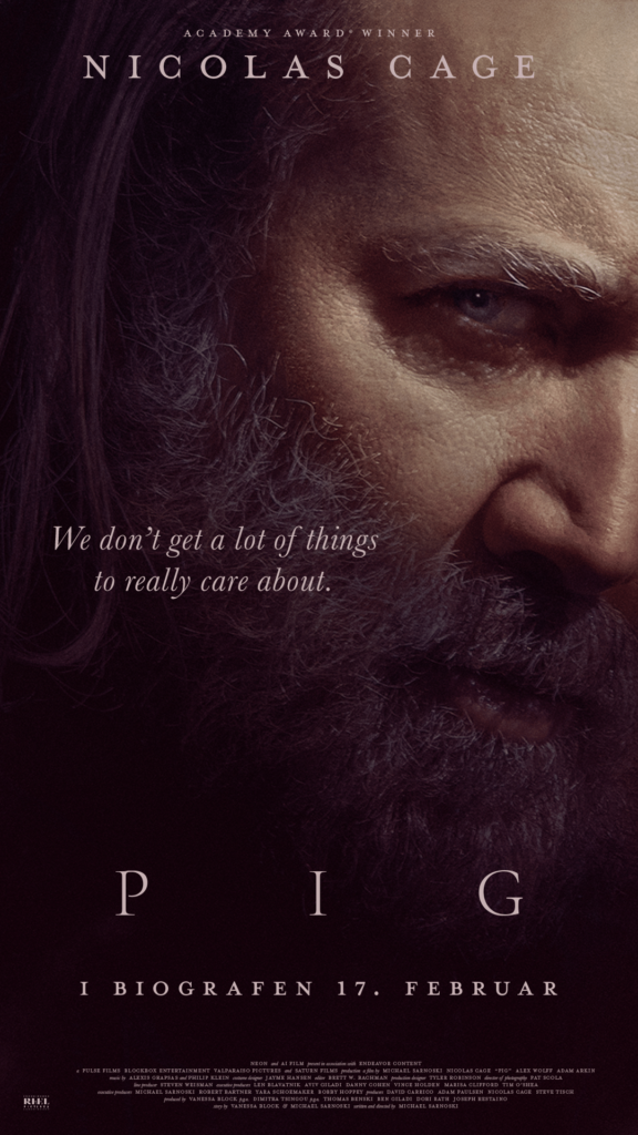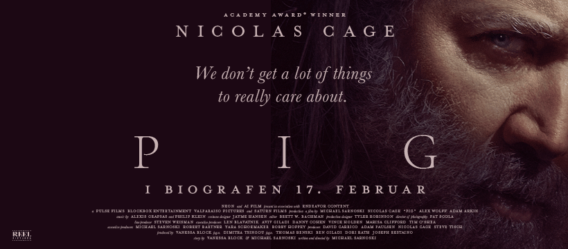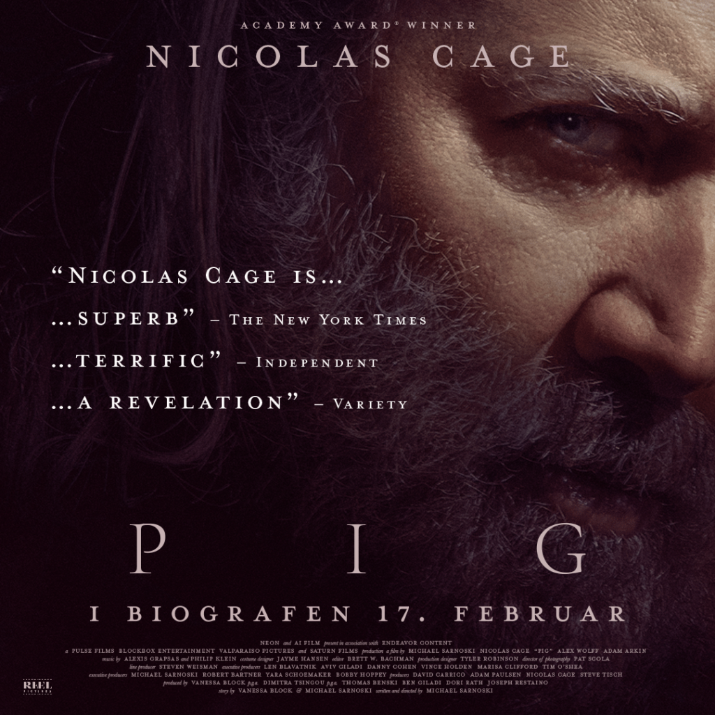 ”Cage er en åbenbaring”, skrev Variety ved den amerikanske premiere. Og med 97% Fresh-rating på Rotten Tomatoes, ’Must See’-status på Metacritic og en Top 10-åbning på den amerikanske boxoffice-liste er PIG et uomgængeligt comeback for Nicolas Cage. Filmen er pt. nomineret til en Gotham Award for Bedste Film og herhjemme har Filmmagasinet Ekko kvitteret med 5 stjerner i deres seneste magasin: “Pig er en film med hjerte, og den bliver siddende i kroppen”.